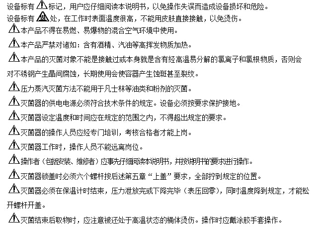 標(biāo)記,表示在工況條件下滅菌器表面溫度很高,使用時(shí)請(qǐng)操作者的人體肌膚不能直接接觸桶體,以防燙傷;