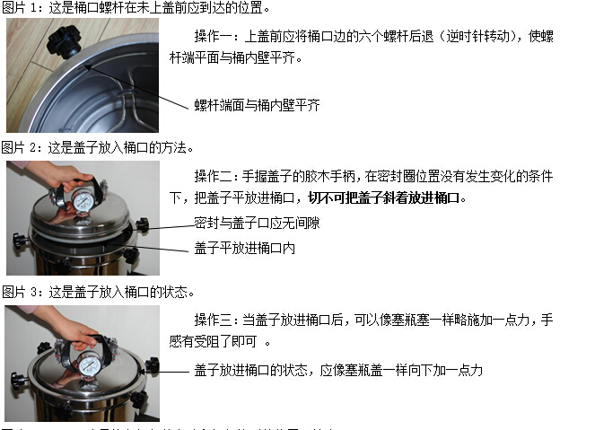 c 適當(dāng)退出已經(jīng)擰在滅菌器桶口邊上的膠木螺釘,使螺釘端頭離開(kāi)器蓋的邊緣,然后小心提起器蓋。切勿使用提拉放汽管的方法提起器蓋。